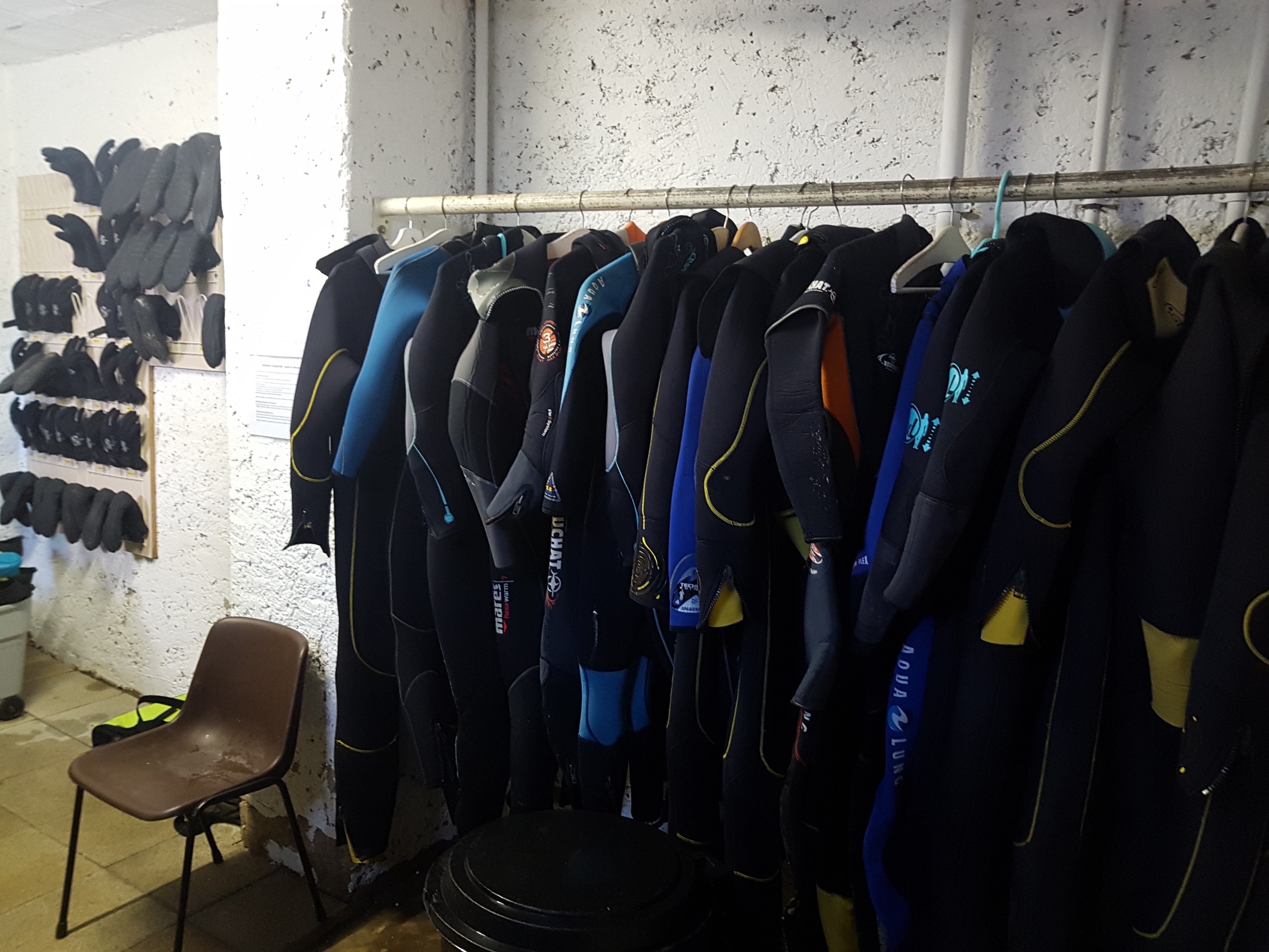 Un grand local est équipé pour le nettoyage et le stockage des vêtements de plongée : combinaisons, shorty, chaussons et gants).