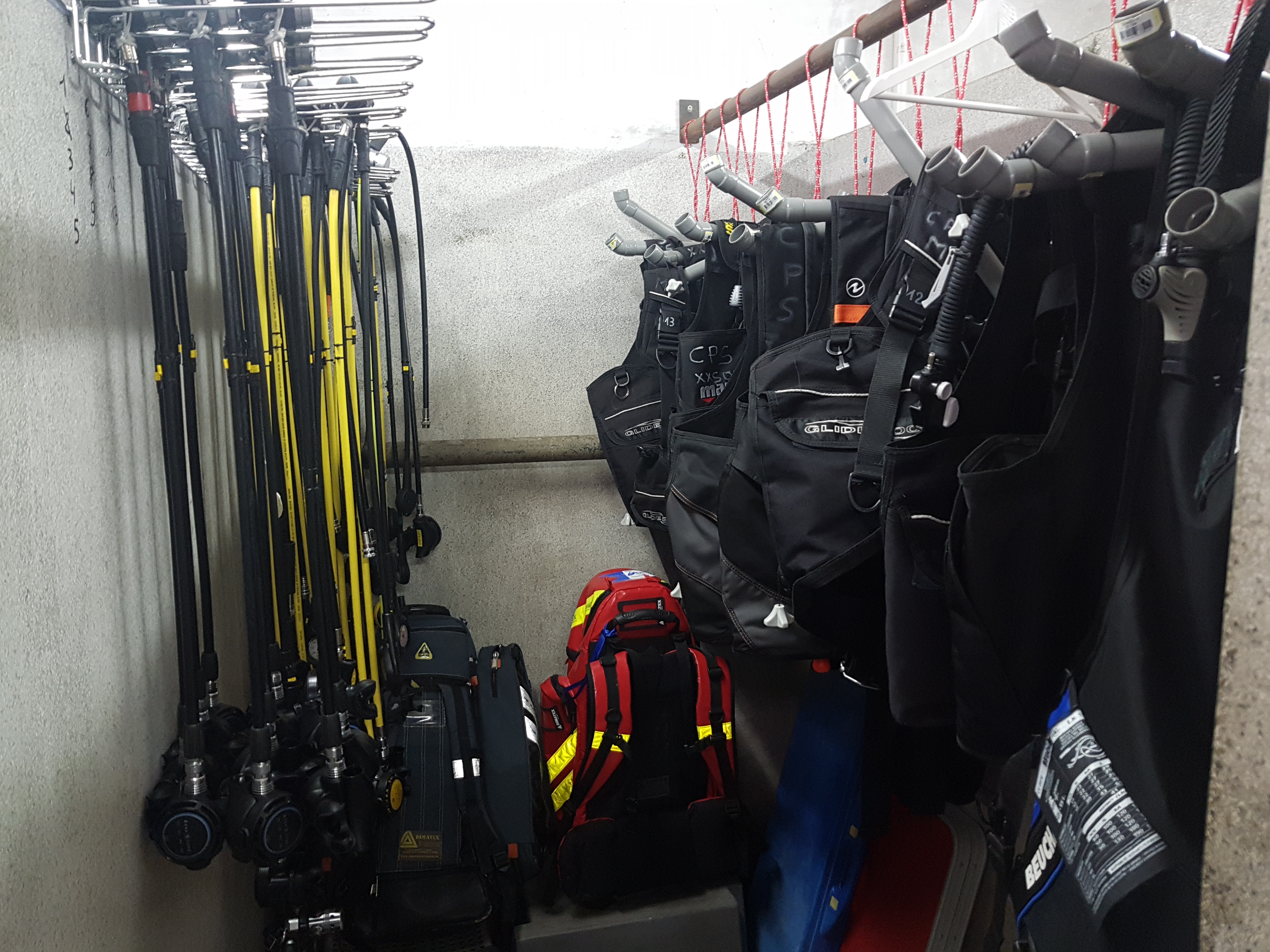 Un grand local équipé de différentes alvéoles pour ranger gilets, détendeurs, matériel de secours, blocs, palmes piscine, instruments etc..